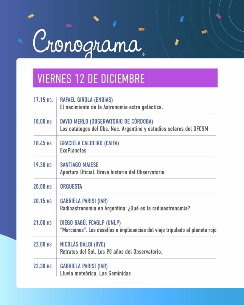 Además, habrá un domo inmersivo, lectura bajo las estrellas, charlas sobre la historia del observatorio, presentaciones del Museo de Ciencias Naturales Bernardino Rivadavia y el Museo Mariposas del Mundo. Ambas jornadas contarán con foodtrucks y música de orquesta en vivo.