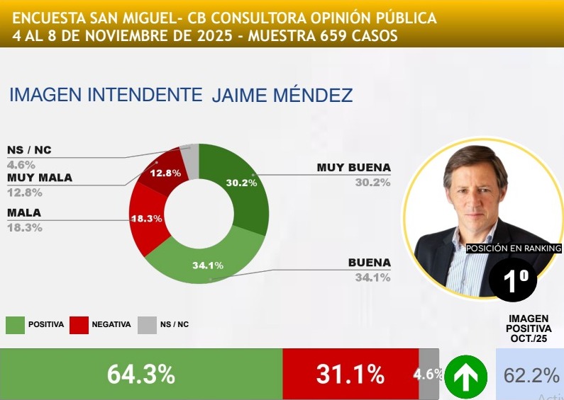 Jaime Méndez no sólo lidera el ranking general, sino que fue el intendente que más creció respecto de la medición previa, con un salto de +2,1 puntos en su imagen.