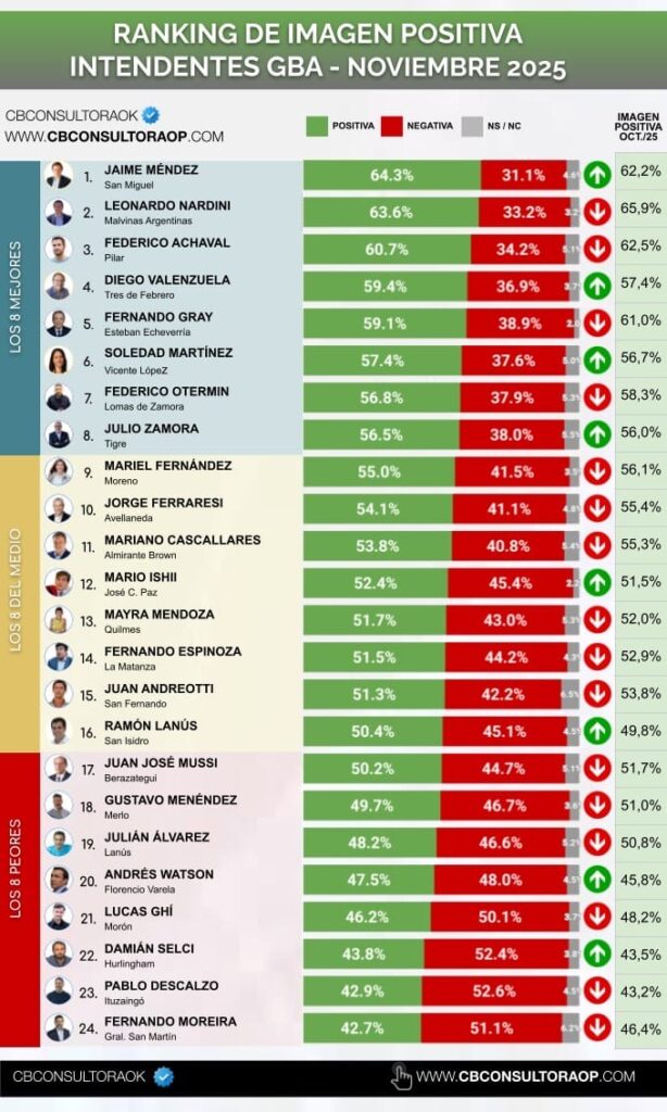 Los otros dos intendentes que ocupan el podio son Leonardo Nardini, de Malvinas Argentinas, en segundo puesto con el 64,3% de aprobación, y Federico Achával, de Pilar, en tercer puesto y con una imagen positiva del 60,7%.